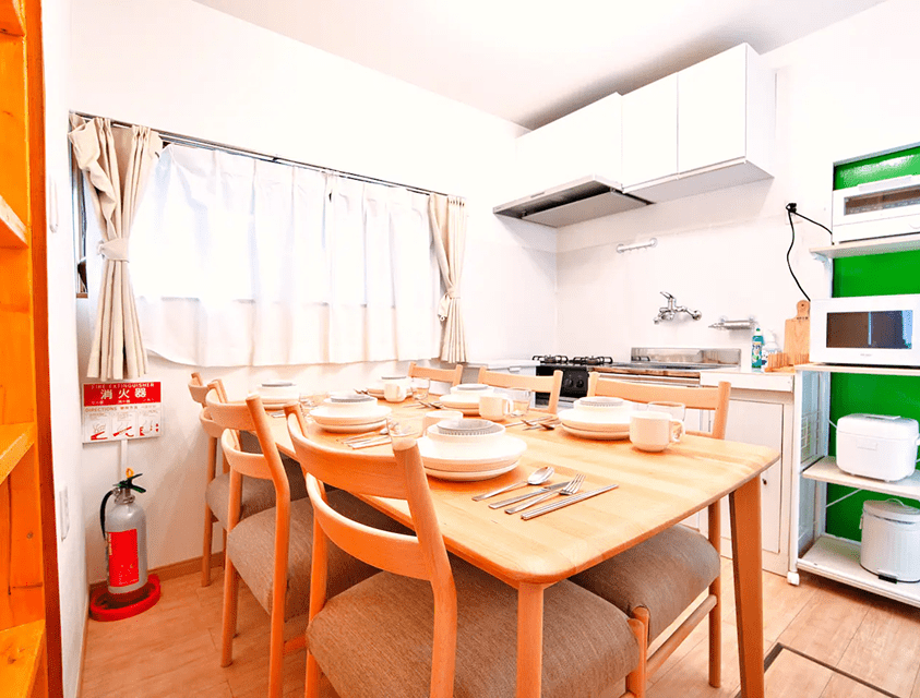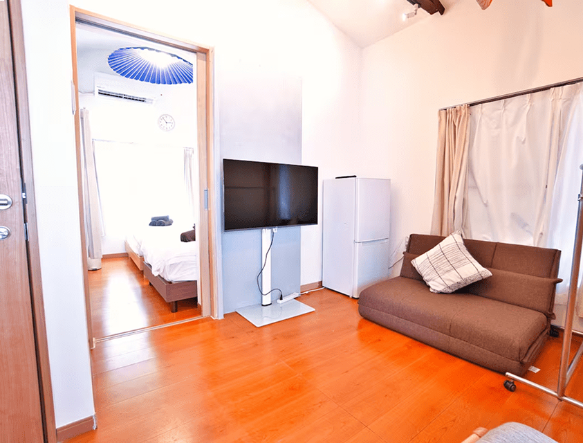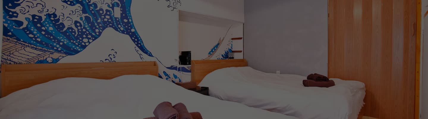 JR小岩駅から徒歩わずか5分の場所にある、最大8名様までご利用いただけるフルリノベーションしたまるまる貸し切りの戸建住宅です。日本での旅行を楽しんでいただけるように和のデザインで仕上げました。葛飾北斎の神奈川沖浪裏(Grate Wave)と赤富士のアート壁紙をお楽しみいただけます。 1階は寝室とダイニングキッチン、シャワールーム、トイレがあり、寝室1にはダブルベッドが2台あります。またラゲッジスペースをご用意していますので、旅行鞄を置いていただけます。(おおよそ2個程度) 2階は寝室が2つあり簡易キッチン、シャワールーム、トイレがあり、バルコニーに洗濯機があります。2階のキッチンは簡易キッチンのため、食器がありませんが、1階のキッチンの食器をご利用ください。