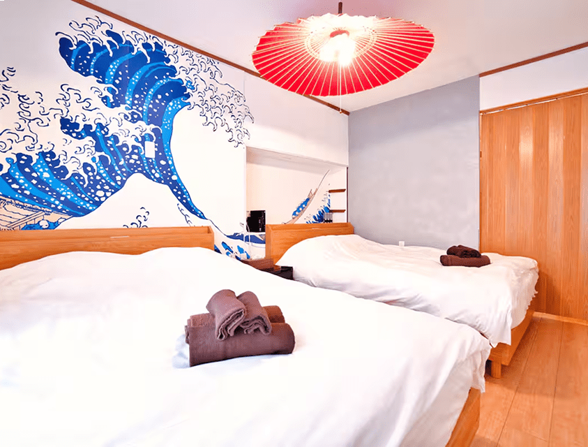 JR小岩駅から徒歩わずか5分の場所にある、最大8名様までご利用いただけるフルリノベーションしたまるまる貸し切りの戸建住宅。葛飾北斎の神奈川沖浪裏(Grate Wave)と赤富士のアートと和のデザインを融合させた空間。