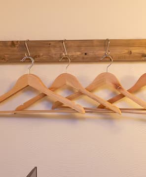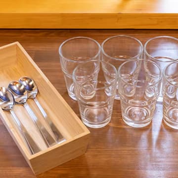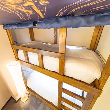 細やかな心配りが光る空間には、波模様の時計や整えられたカトラリー、温もりある木製の二段ベッド、使い勝手の良いハンガーラックが揃い、滞在をより快適にしてくれる。