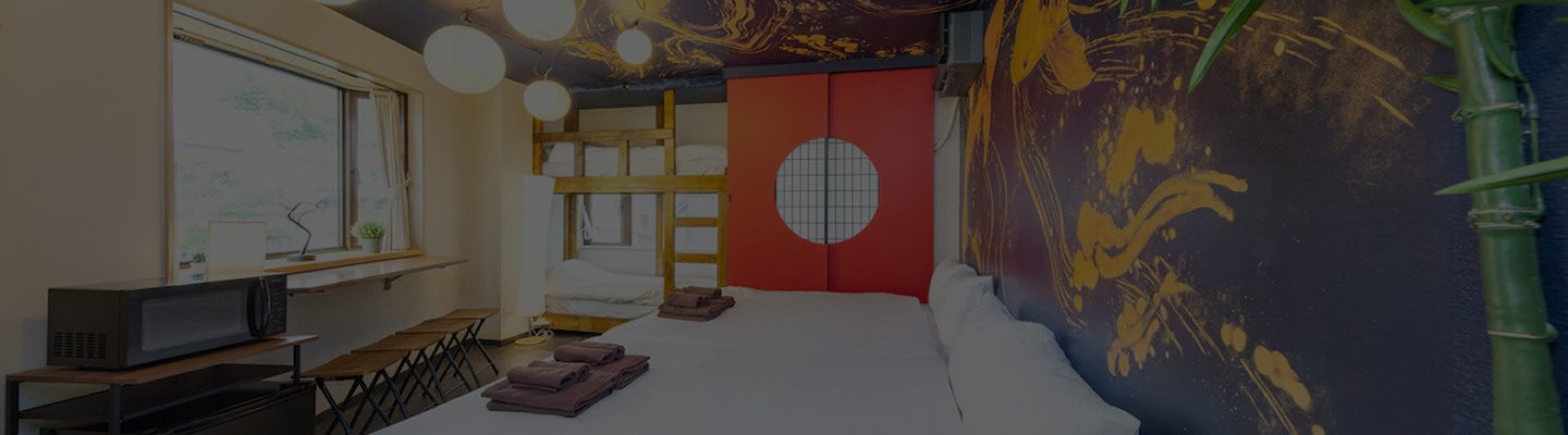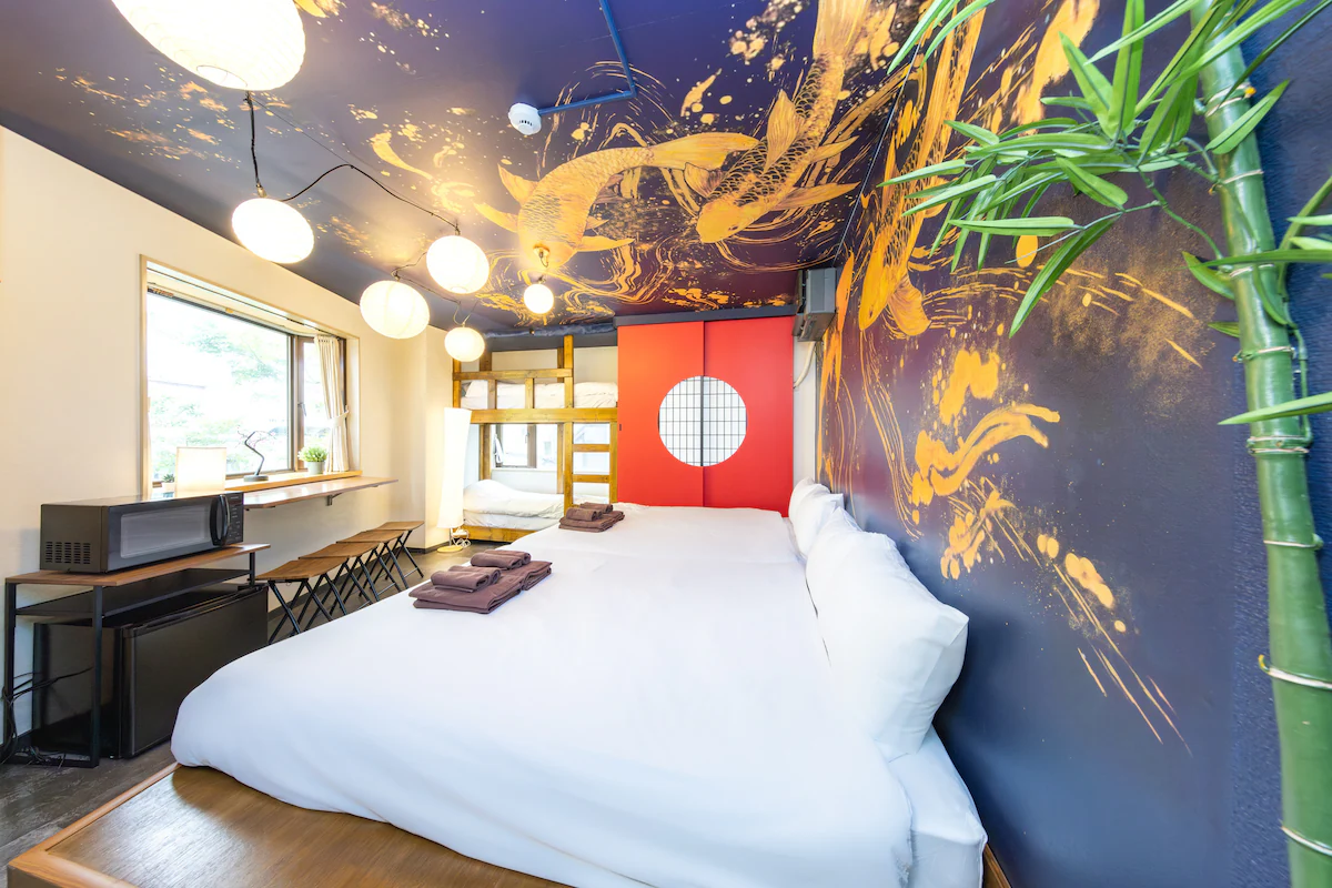 恵比寿駅から徒歩わずか5分、渋谷駅から12分の場所にある、最大6名様までご利用いただける1Rの部屋です。壁いっぱいに力強く描かれた鯉と静けさを感じさせる竹の灯りが装飾された、和と静寂が融合した雅やかな空間をお楽しみいただけます。観光やビジネスにも最適な立地で、恵比寿の魅力を存分に堪能できます。グループやご家族でのご宿泊にもぴったりなお部屋です。